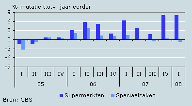 In het eerste kwartaal van 2008 boekten de winkels in voedings- en genotmiddelen 6,7 procent meer omzet dan in dezelfde periode een jaar eerder. De omzetgroei was daarmee ongeveer even hoog als in het vierde kwartaal van 2007. De prijzen stegen met 3,4 procent. Vooral zuivel- en graanproducten waren duurder dan een jaar eerder. Het volume van de omzet was 3,2 procent groter.