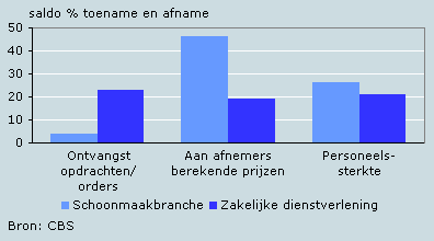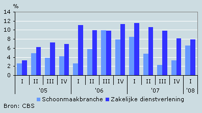 De schoonmaakbranche heeft in het eerste kwartaal 6,5 procent meer omgezet dan in hetzelfde kwartaal in 2007. De omzettoename komt voor twee vijfde door gestegen prijzen. Het volume groeide met bijna 4 procent ten opzichte van het eerste kwartaal vorig jaar. Bedrijven die gebouwen reinigen hebben 7,7 procent meer omgezet. Hier stegen de prijzen met 2,4 procent. De volumegroei bij de bedrijven die gebouwen reinigen, bedroeg ruim 5 procent. De omzetgroei van de schoonmaakbranche was in het eerste kwartaal hoger dan in de voorgaande drie kwartalen. Toen zette de branche elk kwartaal gemiddeld 3,4 procent meer om dan in het overeenkomstige kwartaal een jaar eerder. De groei van de schoonmaakbedrijven bleef iets achter bij de gemiddelde omzetgroei van de zakelijke dienstverlening in zijn geheel. Daar was de omzetgroei bijna 8 procent ten opzichte van het eerste kwartaal van 2007.