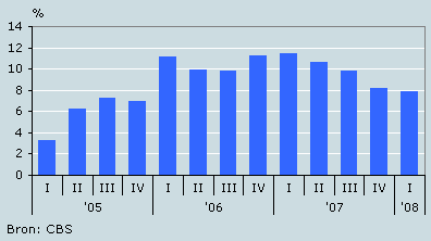 De omzet van de zakelijke dienstverleners was in het eerste kwartaal 8 procent hoger dan een jaar eerder. De ontwikkeling van de omzet binnen de verschillende branches in de zakelijke dienstverlening vertoonde een divers beeld. De uitzendbureaus realiseerden in het eerste kwartaal opnieuw de hoogste omzetgroei, maar de groei is de laatste vier kwartalen steeds afgenomen. Dit is in de uitzendbranche echter gebruikelijk na een langere periode van economische groei. Bij de schoonmaakbedrijven verdubbelde de omzetgroei in vergelijking met het vorige kwartaal. Ook de reclamebureaus, die 2007 nog met een omzetdaling afsloten, behaalden nu een bescheiden omzetgroei.