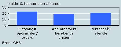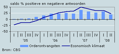 Voor het tweede kwartaal van 2008 blijven de ondernemers optimistisch in hun verwachtingen. Er wordt een verdere stijging van de orders voorzien, per saldo denkt 23 procent van de ondernemers meer orders te zullen ontvangen. Vorig kwartaal was dit nog 43 procent. Ook voorzien de ondernemers de komende maanden een verdere stijging van de afzetprijzen. De verwachting is dan ook dat de omzet verder zal toenemen in het tweede kwartaal. De ondernemers blijven optimistisch over de toekomstige personeelssterkte: 26 procent verwacht een uitbreiding, terwijl slechts 5 procent een daling voorziet. Verder geeft circa 40 procent van de ondernemers aan dat een tekort aan arbeidskrachten een mogelijke belemmering vormt voor hun activiteiten.