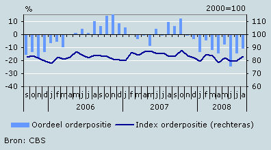 De orderontvangsten zijn volgens de ondernemers in juli flink afgenomen ten opzichte van juni. Het oordeel van de ondernemers over de orderontvangsten is echter minder negatief. Ook het oordeel over de voorraden gereed product is minder negatief. De index orderpositie is licht gestegen en bedraagt 83,1 (juli 2000=100). Het oordeel over de orderpositie is minder negatief dan vorige maand. Ook over de buitenlandse orderpositie waren de ondernemers minder negatief gestemd.
