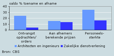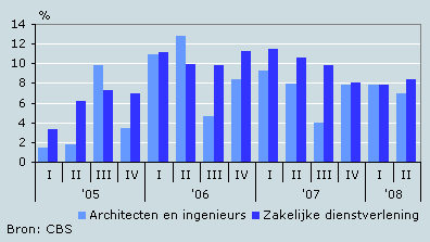 De architecten- en ingenieursbureaus hebben in het tweede kwartaal van 2008 bijna 7 procent meer omgezet dan in de vergelijkbare periode vorig jaar. In het eerste kwartaal kwam de omzet nog bijna 8 procent hoger uit. De architecten- en ingenieursbureaus presteerden in het tweede kwartaal modaal binnen de gehele zakelijke dienstverlening. Die branche zette ruim 8 procent meer om dan in de overeenkomstige periode een jaar eerder.