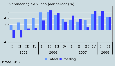 Door huishoudens werd in het tweede kwartaal van 2008 4,4 procent meer uitgegeven aan goederen en diensten. De toename van de uitgaven aan voedingsmiddelen lag met 4,3 procent in dezelfde orde van grootte.