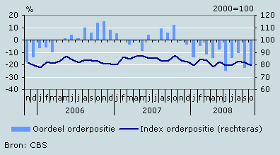 De orderontvangsten zijn volgens de ondernemers in september flink afgenomen ten opzichte van augustus. Het oordeel over de voorraden gereed product is flink verslechterd. De index orderpositie is licht gedaald en bedraagt 79,3 (juli 2000=100). Het oordeel over de orderpositie is niet veranderd ten opzichte van vorige maand en blijft zeer negatief. Ook over de buitenlandse orderpositie waren de ondernemers negatief gestemd.