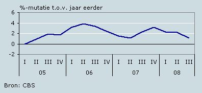 Huishoudens hebben in het derde kwartaal 1,1 procent meer besteed aan goederen en diensten dan een jaar eerder. Daarmee vertraagde de consumptiegroei, die in de eerste helft van 2008 nog iets boven de 2 procent lag. De cijfers zijn gecorrigeerd voor prijsveranderingen. Ruim een derde van de consumptieve bestedingen wordt bij de detailhandel gedaan.