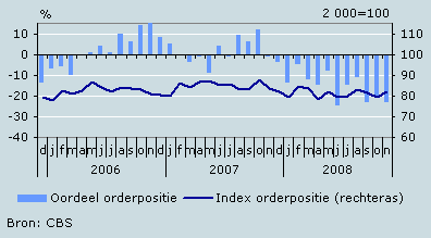 De orderontvangsten zijn volgens de ondernemers in oktober flink afgenomen ten opzichte van september. Het oordeel over de voorraden gereed product blijft negatief. De index orderpositie is licht gestegen en bedraagt 82,1 (juli 2000=100). Het oordeel over de orderpositie is niet veranderd ten opzichte van vorige maand en blijft zeer negatief. Over de buitenlandse orderpositie waren de ondernemers negatiever gestemd dan in de vorige maand.