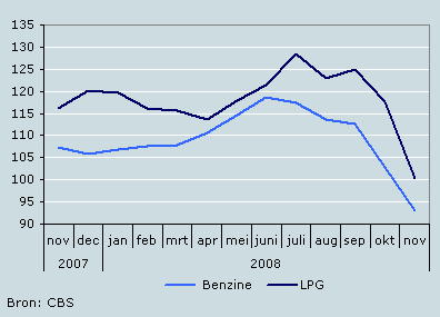 De prijzen van motorbrandstoffen zijn opnieuw sterk gedaald. LPG was in november 2008 bijna 15 procent goedkoper dan een maand eerder. De prijzen van benzine daalden met bijna 10 procent. De prijsdalingen zijn het gevolg van de olieprijsontwikkeling op de wereldmarkt. Ook aardappelen waren goedkoper dan een maand eerder.