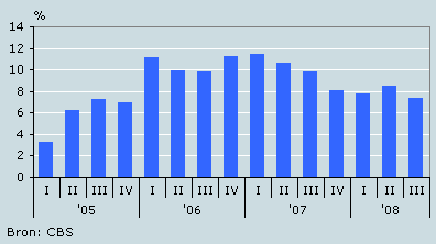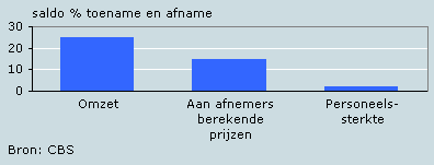 In vergelijking met een jaar eerder nam de omzet van de zakelijke dienstverleners dit kwartaal met bijna 7 procent toe. De omzetgroei is hiermee iets lager uitgekomen dan in dezelfde periode van voorgaand jaar. De belangrijkste oorzaak is de halvering van de omzetgroei in de uitzendbranche. Positieve uitschieters waren de economische dienstverleners, architecten en ingenieurs en de beveiligings- en opsporingsbranche. De vraag naar beveiligings- en opsporingsdiensten groeide het sterkst. De omzet nam met 10 procent toe in vergelijking met het derde kwartaal van 2007.