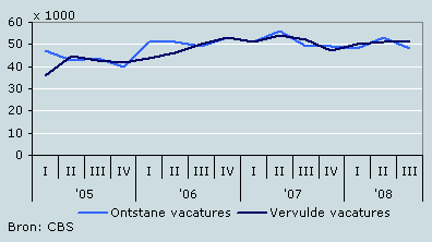 In vergelijking met het derde kwartaal van 2007 is het aantal openstaande vacatures vrijwel onveranderd. Eind september waren er 50 duizend openstaande vacatures in de zakelijke dienstverlening. Ook de vraag naar nieuw personeel blijft onverminderd hoog. Het aantal nieuwe vacatures is in het derde kwartaal op 48 duizend uitgekomen, nagenoeg evenveel als een jaar eerder. De vraag naar arbeidskrachten was het grootst bij de juridische en economische dienstverleners en bij de architecten en ingenieurs. Bijna de helft van de openstaande vacatures komt voor rekening van deze branches.