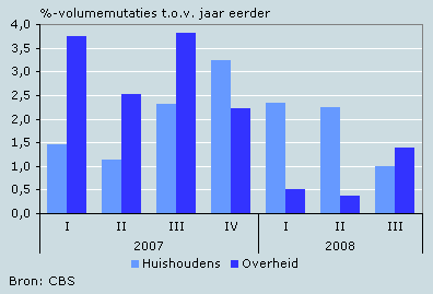 Het volume van de overheidsconsumptie was in het derde kwartaal 1,4 procent hoger dan in het overeenkomstige kwartaal van 2007. In het eerste en tweede kwartaal van dit jaar bedroeg de groei van de overheidsconsumptie respectievelijk 0,5 procent en 0,4 procent. De groeiversnelling in het derde kwartaal van dit jaar komt vooral door de collectieve overheidsconsumptie en wordt veroorzaakt door een hoger intermediair verbruik bij Defensie en, hoewel in mindere mate, bij het Rijk. Over het hele jaar 2007 was de groei nog robuust met 3,0 procent. De teruggang is min of meer het gevolg van de invoering van het eigen risico voor huishoudens bij de zorg. Hierdoor verschoof een deel van de consumptie van de overheid naar de huishoudens.