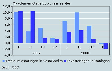 De investeringen in vaste activa waren in het vierde kwartaal van 2008 in totaal 0,3 procent lager dan een jaar eerder. In de eerste helft van 2008 groeiden de investeringen nog met 8,5 procent. Over het gehele jaar 2008 bedroeg de investeringsgroei gemiddeld 5,6 procent.