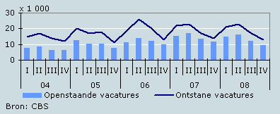 In het vierde kwartaal ontstonden 13 duizend nieuwe vacatures in de horeca. Dit zijn er duizend minder dan in hetzelfde kwartaal van 2007. Tegelijkertijd werden er 15 duizend vacatures vervuld. Ondanks de dalende omzetten vanaf het derde kwartaal van 2008 bleven de horecaondernemers op zoek naar nieuw personeel. Over heel 2008 ontstonden 74 duizend nieuwe vacatures, slechts 2 duizend minder dan in 2007. Aan het eind van het jaar waren er 9 500 openstaande vacatures tegen 11 600 eind 2007.