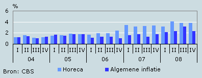 De prijzen in de traditionele horeca stegen in het vierde kwartaal met 3,8 procent in vergelijking met hetzelfde kwartaal in 2007. De gemiddelde prijsstijging over heel 2008 lag op hetzelfde niveau. Tussen de verschillende horecabranches zijn er geen grote verschillen in prijsontwikkeling.