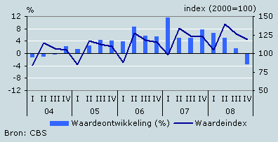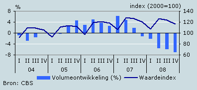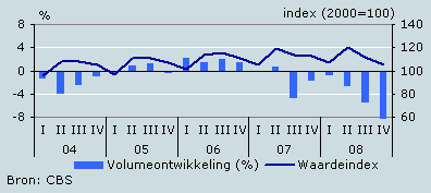 De omzet van de restaurants is in het vierde kwartaal opnieuw afgenomen. In vergelijking met een jaar eerder daalde de omzet met bijna 3 procent. De prijzen stegen met 4,6 procent. Vooral vlees en vis werden afgelopen kwartaal duurder. Het omzetvolume kwam in het vierde kwartaal voor het vijfde opeenvolgende kwartaal lager uit. In vergelijking met een jaar eerder daalde het omzetvolume met 7 procent. Over heel 2008 daalde het omzetvolume ruim 5 procent. Omdat de prijzen met 4 procent stegen bleef de omzetdaling in 2008 beperkt tot 1,4 procent.