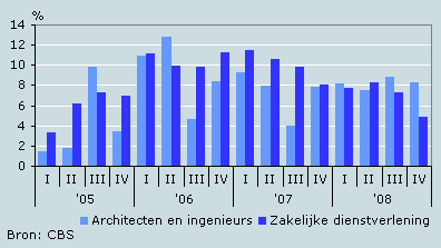 De omzet van de architecten- en ingenieursbureaus is in het vierde kwartaal van 2008 met ruim 8 procent gegroeid ten opzichte van hetzelfde kwartaal in 2007. De architecten- en ingenieursbureaus noteerden met dit resultaat de op een na hoogste groei binnen de gehele zakelijke dienstverlening. Alleen de branche keuring en controle deed het in het laatste kwartaal van 2008 beter met een omzetgroei van 10 procent. De zakelijke dienstverlening als geheel zette gemiddeld bijna 5 procent meer om dan in het vergelijkbare kwartaal van 2007.