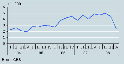Het aantal openstaande vacatures is flink gedaald. Eind december stonden er 2 400 duizend vacatures open. Dat is de helft minder dan een jaar eerder. In het vierde kwartaal van 2008 zijn er 3 duizend vacatures bijgekomen. De vraag naar nieuw personeel is flink afgenomen in vergelijking met het vierde kwartaal van 2007, toen er nog 6 duizend vacatures ontstonden. Het aantal vervulde vacatures kwam in het vierde kwartaal uit op 5 duizend.