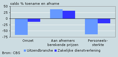 Ondernemers zijn pessimistisch in hun verwachtingen voor het eerste kwartaal van 2009. Van de ondernemers verwacht verwacht 76 procent een omzetdaling in het eerste kwartaal van 2009, terwijl 10 procent een toename verwacht. Daarentegen voorziet per saldo iets meer dan een derde van de ondernemers een stijging van de afzetprijzen. Een afname van de personeelssterkte wordt per saldo door 64 procent van de ondernemers verwacht in het komende kwartaal. Over het algemeen zijn de ondernemers in de zakelijke dienstverlening minder pessimistisch dan de ondernemers in de uitzendbranche.