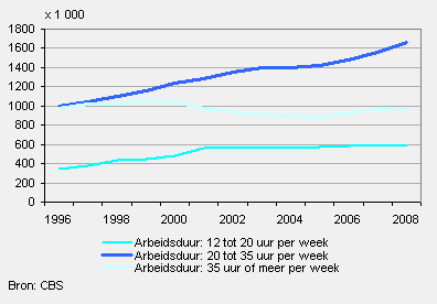 De toename van de vrouwelijke werkzame beroepsbevolking komt bijna geheel voor rekening van vrouwen met een grote deeltijdbaan (20 tot 35 uur per week). In 1996 waren er nog 1 miljoen vrouwen met een grote deeltijdbaan, tegen 1,7 miljoen in 2008. Dit is een toename van bijna 70 procent. In tegenstelling tot de vrouwen werkten mannen bijna allemaal voltijd (35 uur of meer).