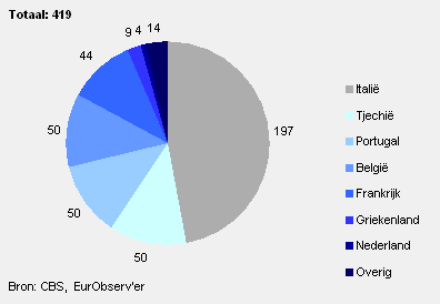 In totaal staat er eind 2008 in Europa 9,5 duizend megawatt opgesteld. Ook in die ranglijst staan Duitsland en Spanje, met respectievelijk 5 351 en 3 405 megawatt, bovenaan. Nederland staat met een totaal vermogen van 57 megawatt op de zevende plaats.