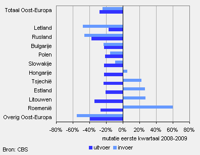 Nederland exporteerde in het eerste kwartaal van 2009 voor 5,2 miljard euro naar Oost-Europa. Dit is bijna 28 procent minder dan een jaar eerder. De totale exportwaarde van Nederland verminderde in deze periode met zo’n 20 procent.