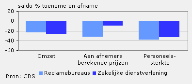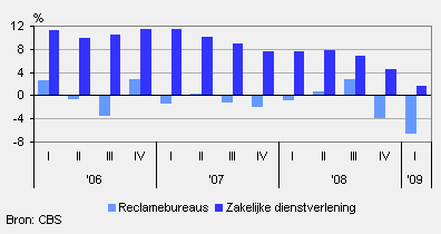 De omzet in de reclamebranche is in het eerste kwartaal van 2009 fors gedaald ten opzichte van een jaar eerder. Hiermee blijft deze branche de minst presenterende binnen de zakelijke dienstverlening. De stemming onder de ondernemers is nog steeds slecht, zo blijkt uit de conjunctuurtest van april 2009. De verwachtingen voor het tweede kwartaal zijn over de gehele linie pessimistisch.