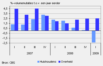 Nederlandse huishoudens gaven in het eerste kwartaal van 2009 2,4 procent minder uit dan in dezelfde periode een jaar eerder. Het is voor het eerst in vier jaar dat de Nederlandse consument minder uitgeeft. In geheel 2008 nam de consumptie door huishoudens nog toe met 1,2 procent. De daling in uitgaven aan duurzame consumptiegoederen die eind 2008 inzette, heeft zich ook in het eerste kwartaal van dit jaar doorgezet. Er werd minder uitgegeven aan bijvoorbeeld kleding, meubelinrichting en consumentenelectronica. Een veel grotere terugval is er bij de aanschaf van personenauto's. Daarnaast werd er ook minder besteed in de horeca en aan vliegreizen vanaf Nederlands grondgebied.