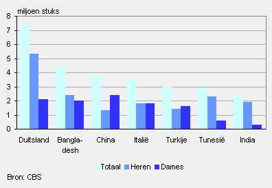Duitsland is de laatste jaren de belangrijkste leverancier van spijkerbroeken. In 2008 kwam een vijfde van alle ingevoerde spijkerbroeken hier vandaan. In de jaren 2002 en 2003 werden de meeste spijkerbroeken uit België gehaald. In 2002 kwam nog meer dan een kwart van alle spijkerbroeken uit België. In 2008 was het aandeel spijkerboeken uit België nog slechts 3 procent.