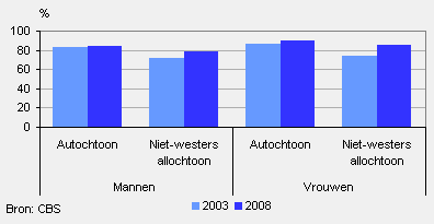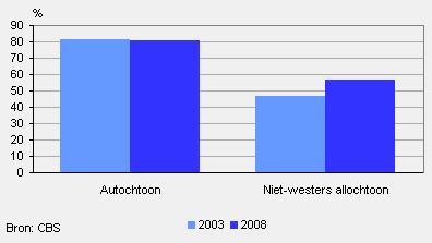 Gesteund door de gunstige economie van de afgelopen jaren nam ook het aandeel jongeren met werk onder de niet-westers allochtonen van 15 tot 23 jaar toe: van 47 procent in 2003 naar 56 procent in 2008. Ondanks deze toename van het aandeel werkzame niet-westers allochtone jongeren beschikken zij nog steeds veel minder vaak over een baan dan autochtone jongeren (respectievelijk 56 en 81 procent in 2008).