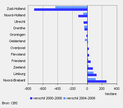 In de periode 2000-2008 is de oppervlakte glastuinbouw in Nederland met bijna 500 hectare afgenomen. Zuid-Holland tekende, met een afname van 700 hectare, voor de grootste daling. In Noord-Holland verminderde de oppervlakte kassen met ruim 100 hectare. Daarentegen steeg het glastuinbouwareaal in Noord-Brabant, Limburg en Zeeland met respectievelijk 250, 125 en 80 hectare.