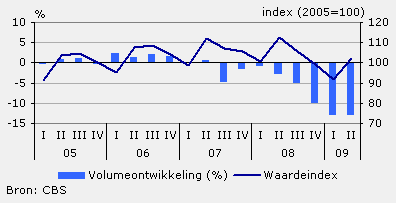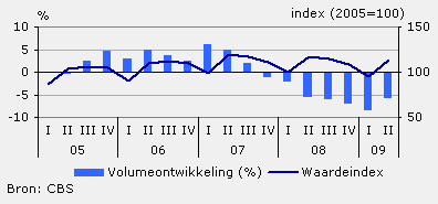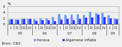 De prijzen in de traditionele horeca lagen in het tweede kwartaal bijna 2 procent hoger dan in hetzelfde kwartaal van 2008. De prijsstijging is lager dan voorgaande kwartalen. In het tweede kwartaal van 2008 was de stijging nog meer dan twee keer zo groot. Het omzetvolume van de traditionele horeca daalde in het tweede kwartaal met bijna 8 procent. De omzet was bijna 6 procent lager dan vorig jaar.