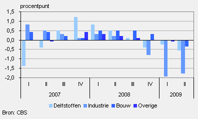 De industriële productie was in het tweede kwartaal bijna 13 procent lager dan een jaar eerder. Deze krimp was iets minder groot dan in het eerste kwartaal. Niettemin daalde de productie in alle branches van de industrie. De grootste productiedaling is gemeten bij de transportmiddelenindustrie (-31 procent), maar ook in de basismetaal- en metaalproductenindustrie, de machine-industrie en de rubber- en kunststofindustrie was de krimp van de productie met ongeveer 20 procent fors. De voedingsmiddelenindustrie presteerde met een ongeveer 3 procent lagere productie nog relatief het beste. De slechte gang van zaken in de industrie hangt vooral samen met de daling van de export.