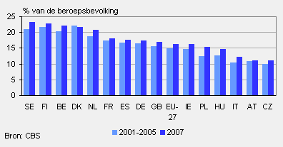 Het aandeel ICT-investeringen in de totale investeringen lag in Nederland wel hoog. Nederland behoort hier tot de eerste groep onder de benchmarklanden. Deze positie is ten opzichte van de referentieperiode zelfs nog verbeterd. Voor de meeste landen geldt dat het aandeel ICT-investeringen in 2007 juist is afgenomen.