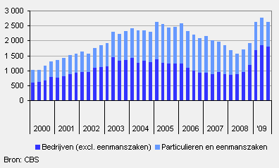 in het derde kwartaal van 2009 gingen 1800 bedrijven en instellingen failliet. Dat is bijna twee keer zo veel als een jaar eerder, toen er 942 bedrijven en instellingen over de kop gingen. Verder waren er 821 particulieren (al dan niet met een eigen bedrijf) die failliet werden verklaard, 10 procent meer dan in het derde kwartaal van 2008.