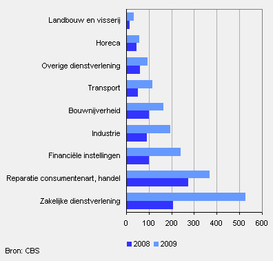 In de zakelijke dienstverlening nam het aantal faillissementen het sterkst toe: in het derde kwartaal van 2009 gingen hier anderhalf keer zo veel bedrijven en instellingen failliet als een jaar eerder. Ook in de industrie nam het aantal faillissementen flink toe: met 120 procent ten opzichte van de periode juli-september van 2008.