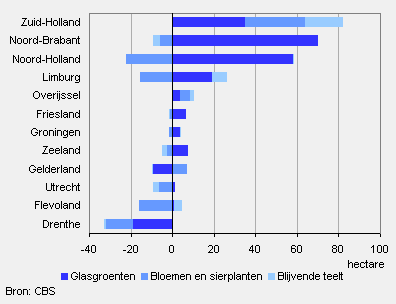 De oppervlakte van glasgroenteteelt steeg in het afgelopen jaar met 180 hectare. In bijna alle provincies nam dit areaal toe. In Noord-Brabant en Noord-Holland was deze areaaluitbreiding het grootst met respectievelijk 70 en 60 hectare. Alleen in de provincies Drenthe en Gelderland was er sprake van een daling. De oppervlakte van de teelt van bloemen en sierplanten is het afgelopen jaar met 40 hectare gedaald. In de provincie Noord-Holland was er een flinke daling (-20 hectare) en in de provincie Zuid-Holland een flinke stijging (+30 hectare). De stijging van het areaal blijvende teelt was 20 hectare en kwam bijna geheel voor rekening van Zuid-Holland.
