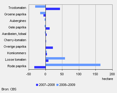 Bij de glasgroenteteelt nam het areaal rode parika’s met ruim 160 hectare het meest toe. Het areaal losse tomaten kwam met een stijging van 60 hectare op de tweede plaats. De sterkste dalers zijn de trostomaten met een afname van 30 hectare en de groene paprika’s met een afname van bijna 20 hectare.