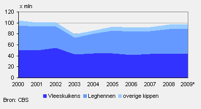 Het aantal kippen in Nederland zit nog iets onder het niveau van voor 2003, het jaar van de vogelgriep. Het aantal vleeskuikens schommelt de laatste zes jaar rond de 43 miljoen. In de jaren daarvoor steeg dit aantal tot bijna 55 miljoen in 2002. Het aantal leghennen is de in laatste jaren met grofweg 45 miljoen dieren, weer vergelijkbaar met het aantal van voor de vogelgriep.