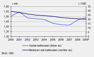 In 2009 telde Nederland 20 duizend boerderijen met melkkoeien, 18 duizend daarvan hebben zich gespecialiseerd in het houden van melkvee. Op deze gespecialiseerde bedrijven is bijna 95 procent van alle melkkoeien te vinden. In totaal waren er 1,5 miljoen melkkoeien, bijna 2 procent meer dan een jaar eerder. Dit blijkt uit voorlopige uitkomsten van de Landbouwtelling 2009.