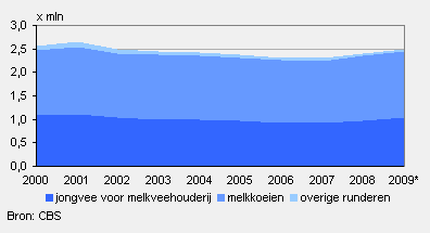 Sinds 2000 is het aantal bedrijven dat runderen houdt afgenomen van bijna 46 duizend naar 33 duizend in 2009. Het aantal runderen bij deze bedrijven is van 4,1 miljoen in 2000 aanvankelijk gedaald naar een aantal iets onder 3,8 miljoen in de periode 2003 tot en met 2007 en vervolgens weer gestegen naar 4,0 miljoen in 2009. De melkveebedrijven zijn eveneens fors in aantal gedaald: van bijna 25 duizend in 2000 naar 18 duizend in 2009.