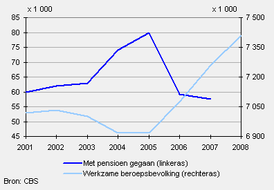 In 2007 gingen bijna 58 duizend mensen met pensioen Van 2001 tot en met 2005 is het aantal mensen dat met pensioen is gegaan steeds toegenomen tot 80 duizend in 2005. In 2006 en 2007 nam het aantal pensioengangers af.
