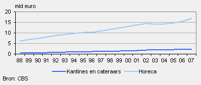 Kantines en cateraars hebben de bedrijfsopbrengsten tussen 1988 en 2007 vervijfvoudigd. In de horeca als geheel verdrievoudigden de bedrijfsopbrengsten in diezelfde periode. De enorme opbrengststijging bij kantines en cateraars komt vooral doordat bedrijven hun cateringactiviteiten steeds vaker uitbesteden aan gespecialiseerde bedrijven.