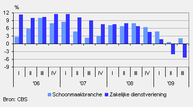 In het derde kwartaal van 2009 heeft de schoonmaakbranche ruim 2 procent meer omzet behaald dan een jaar eerder. De omzettoename komt volledig voor rekening van hogere prijzen. Al sinds de jaarwisseling presteert de subbranche reiniging van gebouwen bovengemiddeld binnen de schoonmaakbranche. In het derde kwartaal zette zij bijna 4 procent meer om. De prijzen die de gebouwreinigingsbedrijven hierbij in rekening brachten, stegen met ruim 3 procent, nagenoeg even hard als in de totale branche. Binnen de zakelijke dienstverlening als geheel behoorde de schoonmaakbranche tot de best presterende branches. De gehele zakelijke dienstverlening zette in het derde kwartaal 5,5 procent minder om dan in hetzelfde kwartaal vorig jaar.