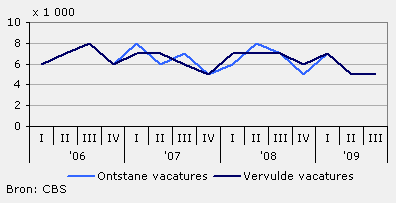In de schoonmaakbranche ontstonden in het derde kwartaal 5 duizend vacatures. Tegelijkertijd is eenzelfde aantal vacatures vervuld. Een jaar lang is het aantal openstaande vacatures in de schoonmaakbranche elk kwartaal afgenomen ten opzichte van het kwartaal ervoor. In het derde kwartaal kwam aan deze reeks van dalingen een einde en bleef het aantal op hetzelfde niveau. De schoonmaakbedrijven sloten het derde kwartaal van 2009 uiteindelijk af met 2 300 openstaande vacatures. Dit waren er 1 200 minder dan aan het eind van het vergelijkbare kwartaal in 2008.