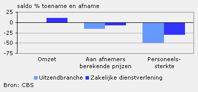 De uitzend- en uitleenbedrijven werden voor het derde achtereenvolgende kwartaal geconfronteerd met een omzetdaling. De omzet van deze bedrijven daalde met 12,5 procent ten opzichte van dezelfde periode een jaar eerder. De omzet nam wel minder sterk af dan in het tweede kwartaal. Door de dalende vraag naar uitzendkrachten (fase A) nam de omzet van uitzendbureaus af. In vergelijking met het derde kwartaal van 2008 daalde hun omzet met 13,5 procent. De uitzend- en uitleenbedrijven behoorden tot de slechtst presterende bedrijven binnen de zakelijke dienstverlening.