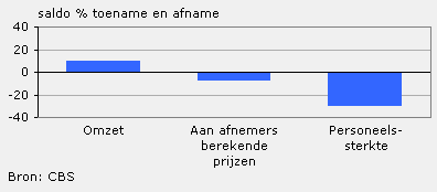 De zakelijke dienstverleners hebben in het derde kwartaal 5,5 procent minder omgezet dan in hetzelfde kwartaal een jaar eerder. Niet alle zakelijke dienstverleners deden het slechter dit kwartaal. Branches die een omzetgroei realiseerden, zoals accountants en ingenieurs, zagen hun groei wel afnemen in vergelijking met eerdere kwartalen. Reclamebureaus hadden het meest te lijden onder de economische crisis, hun omzet daalde in het derde kwartaal met 17 procent in vergelijking met een jaar eerder. De omzetdaling bij uitzend- en uitleenbedrijven lijkt haar dieptepunt te hebben bereikt. De omzetkrimp bedroeg nog wel 12,5 procent, maar was kleiner dan een kwartaal eerder.