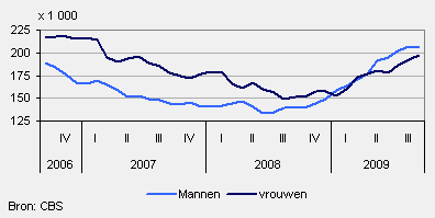 Vóór de recessie waren er meer vrouwen dan mannen werkloos. Door de scherpe stijging van het aantal werkloze mannen in het afgelopen jaar is dat nu niet meer het geval en zijn er juist meer mannen dan vrouwen werkloos. Als percentage uitgedrukt is de werkloosheid onder vrouwen nog wel hoger dan onder mannen. In de periode augustus-oktober 2009 bedroeg de werkloosheid onder vrouwen 5,5 procent en onder mannen 4,6 procent.