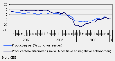 De ondernemers in de industrie behaalden in november bijna 3 procent minder omzet dan een jaar eerder. De afname is veel kleiner dan in oktober. Toen was de omzet nog 17 procent lager dan in oktober 2008. De gemiddelde dagproductie was in november 2 procent lager dan in november 2008. Deze afname is veel kleiner dan die in oktober. Toen was de productie nog 7 procent lager dan een jaar eerder. De industriële productie lag in het eerste half jaar van 2009 circa 13 procent lager dan een jaar eerder; sindsdien is de afname steeds kleiner geworden. Dit is mede toe te schrijven aan de terugval van de productie in de tweede helft van 2008.