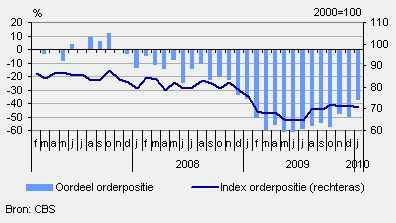Volgens de ondernemers zijn de orderontvangsten in de afgelopen drie maanden licht toegenomen. Het is voor het eerst in de afgelopen anderhalf jaar dat er een toename van de orderontvangsten wordt gemeld. Desondanks daalde de index orderpositie licht naar 70,5 (juli 2000=100). De ondernemers zijn van mening dat hun orderportefeuille nog steeds ontoereikend is. Ook vinden zij de voorraad gereed product te groot.