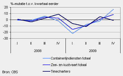De prijzen van het Nederlandse containervervoer over zee zijn in het laatste kwartaal van 2009 met bijna 17 procent gestegen in vergelijking met het voorgaande kwartaal. Zowel het containervervoer naar Nederland als het vervoer vanuit Nederland werd duurder. De vraag naar containervervoer neemt weer wat toe. Daarnaast zorgen de gestegen brandstofkosten voor een extra prijsstijging. Wel zijn de prijzen voor het containervervoer over zee onder Nederlandse vlag nog ruim 17 procent lager dan een jaar eerder.