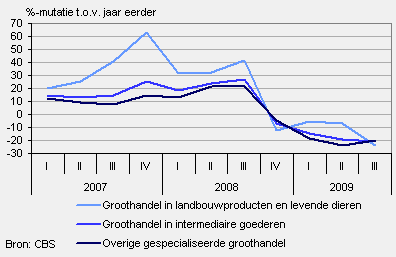 Na een daling van 19,4 procent in het tweede kwartaal hebben de groothandelaren in intermediaire goederen in het derde kwartaal 20,9 procent minder omgezet. De onderdelen van deze branche presteerden daarbij wel verschillend. Zo was de omzet van de groothandel in landbouwproducten en levende dieren in het derde kwartaal 23,5 procent lager. Een kwartaal eerder bleef de daling nog beperkt tot 6,9 procent. De omzet nam in het derde kwartaal sterker af doordat er in het derde kwartaal van 2008 nog sprake was van forse groei. In de overige gespecialiseerde groothandel daalde de omzet in het derde kwartaal (-19,9 procent) iets minder sterk dan in het tweede kwartaal (-23,7 procent). De bedrijven in dit segment handelen onder andere in brandstoffen, metalen, chemische producten en bouwmaterialen.